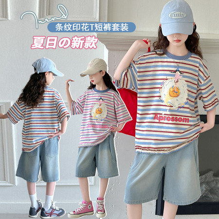 1*9收藏“R72款荷包蛋条纹T牛仔中裤套装”